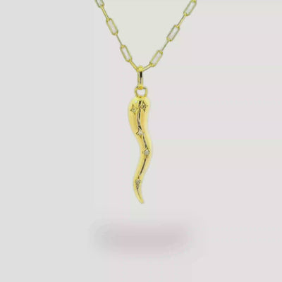 The Cornicello Pendant is handcrafted with approximately .03 carats of melee white sapphire and 2.6 grams of 18k yellow gold plated sterling silver.