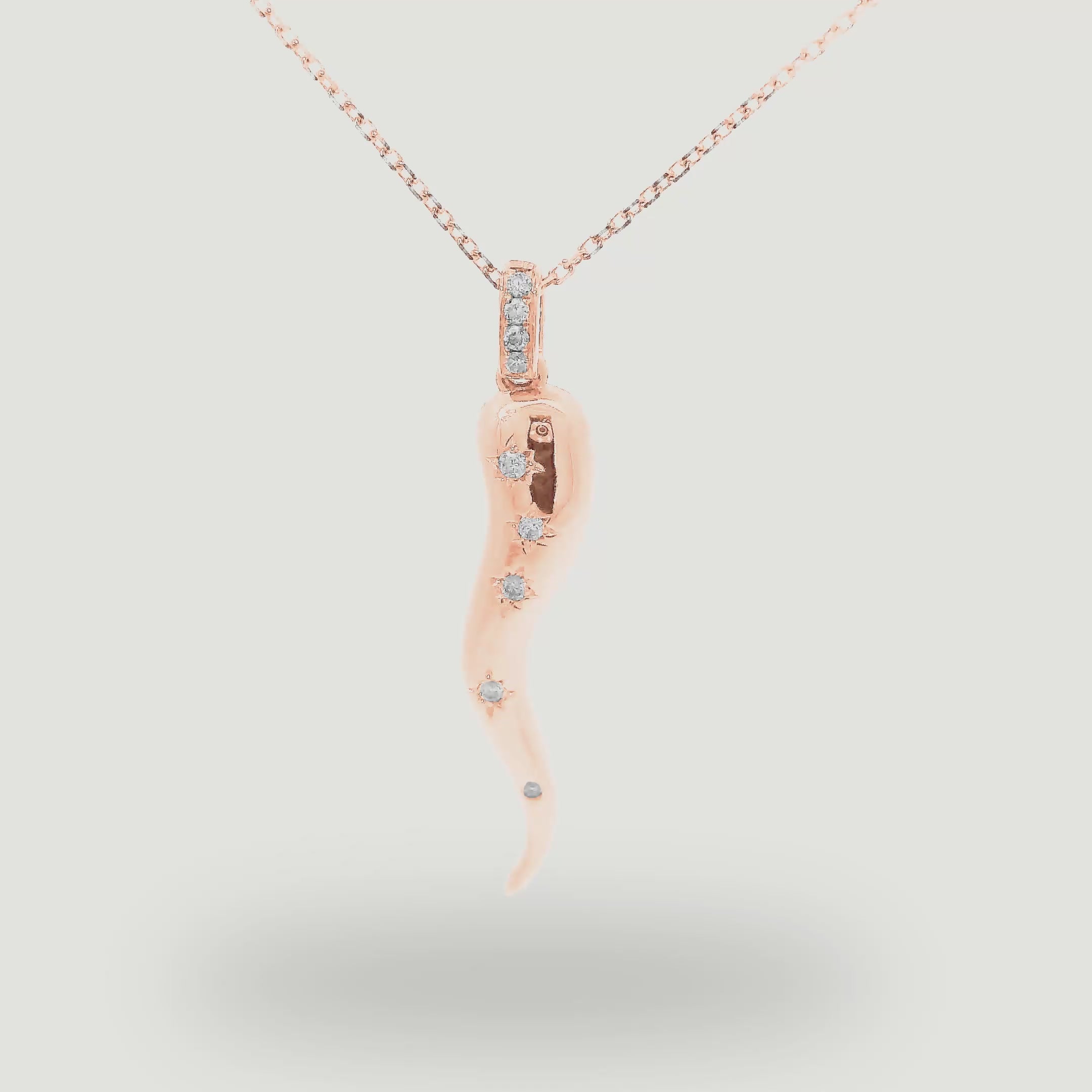 The Cornicello Pendant is handcrafted with approximately 3.7 grams of 18k rose gold and .03 carats of melee diamonds.