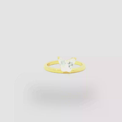 The Farfalla Ring is handcrafted with an approximately 1 carat custom butterfly cut white sapphire and 1.9 grams of 18k yellow gold vermeil.
