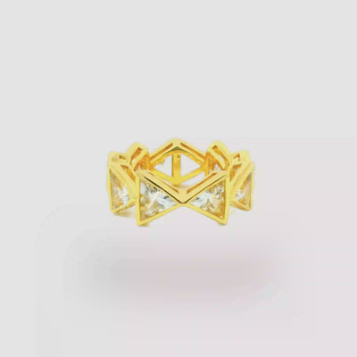 The Triangoli Band is handcrafted with approximately 7 carats of custom pyramid cut white white sapphire in 18k and 6.6 grams of 18k yellow gold vermeil