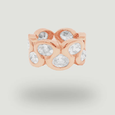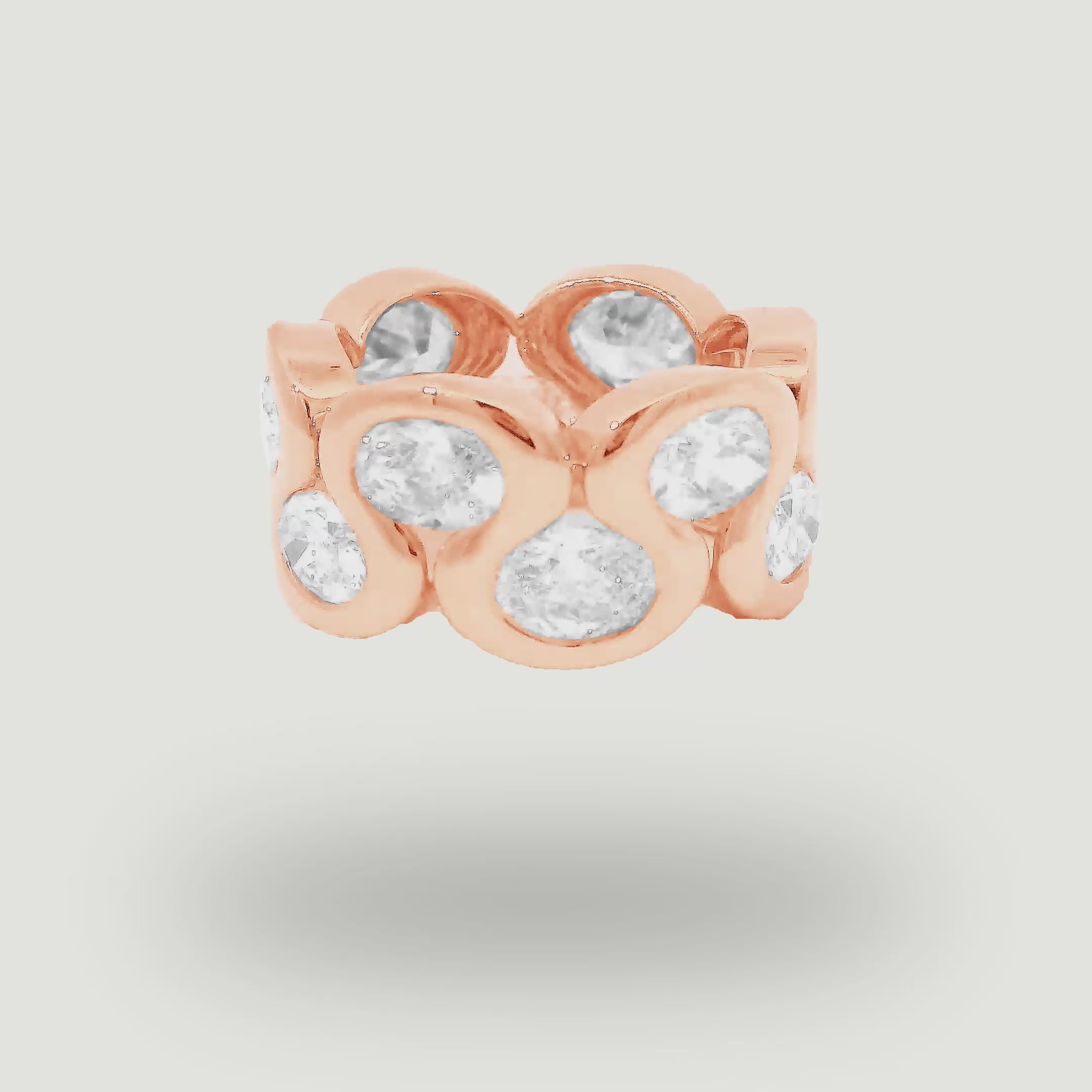 The Dinamismo Band is handcrafted with 12 custom cut cultured oval diamonds of D-E VS quality, weighing approximately 0.54 carats each (6.47 total carat weight) and 5.67 grams of 18k rose gold.