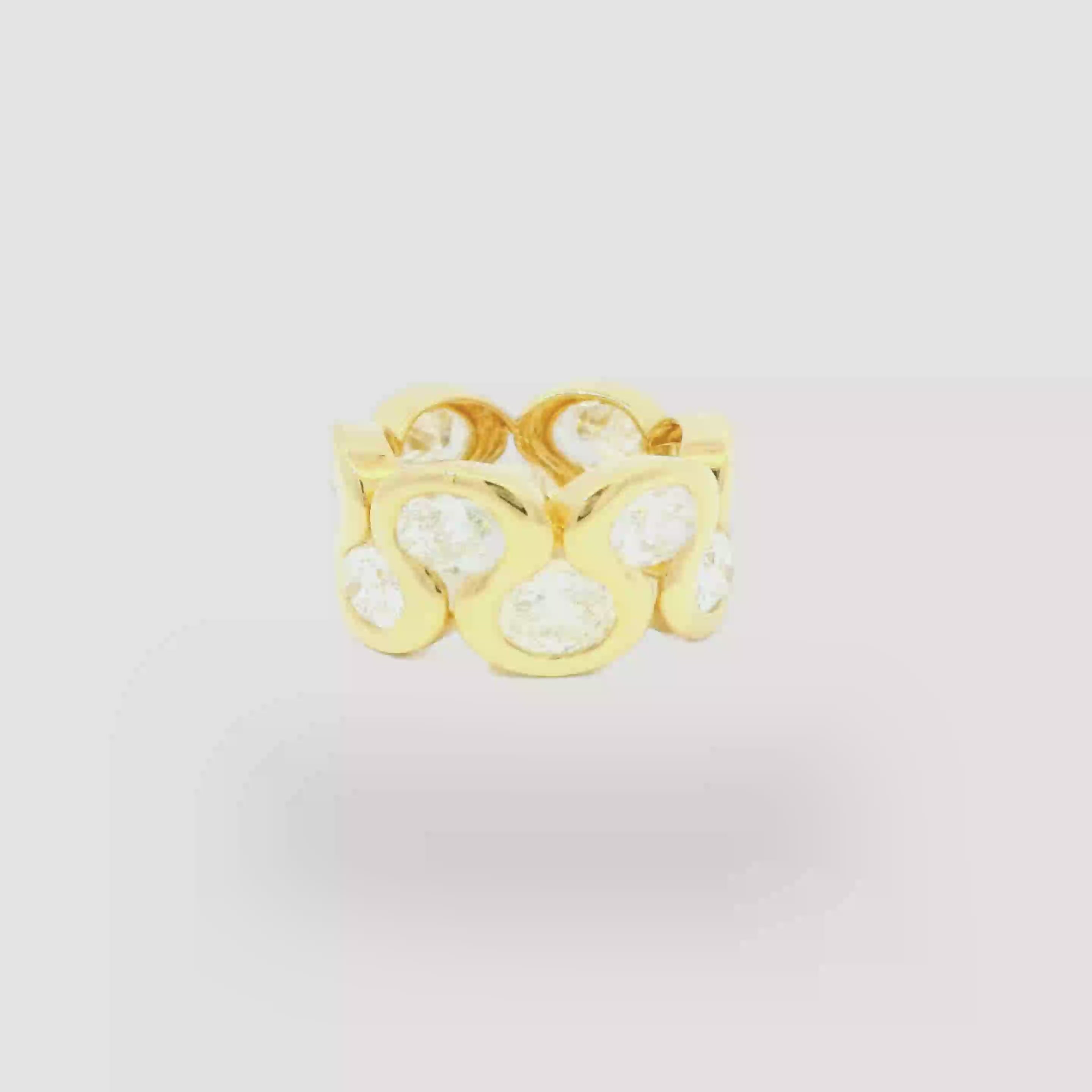 The Dinamismo Band is handcrafted with 12 custom cut cultured oval diamonds of D-E VS quality, weighing approximately 0.54 carats each (6.47 total carat weight) and 5.67 grams of 18k yellow gold.