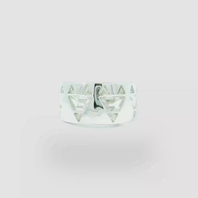 The Volpaccio Band is handcrafted with approximately 6.5 carats of our signature custom cut white sapphire Di Volpe motifs and 16.8 grams of 18k white gold plated sterling silver with an additional underlayer of palladium coating for durability.