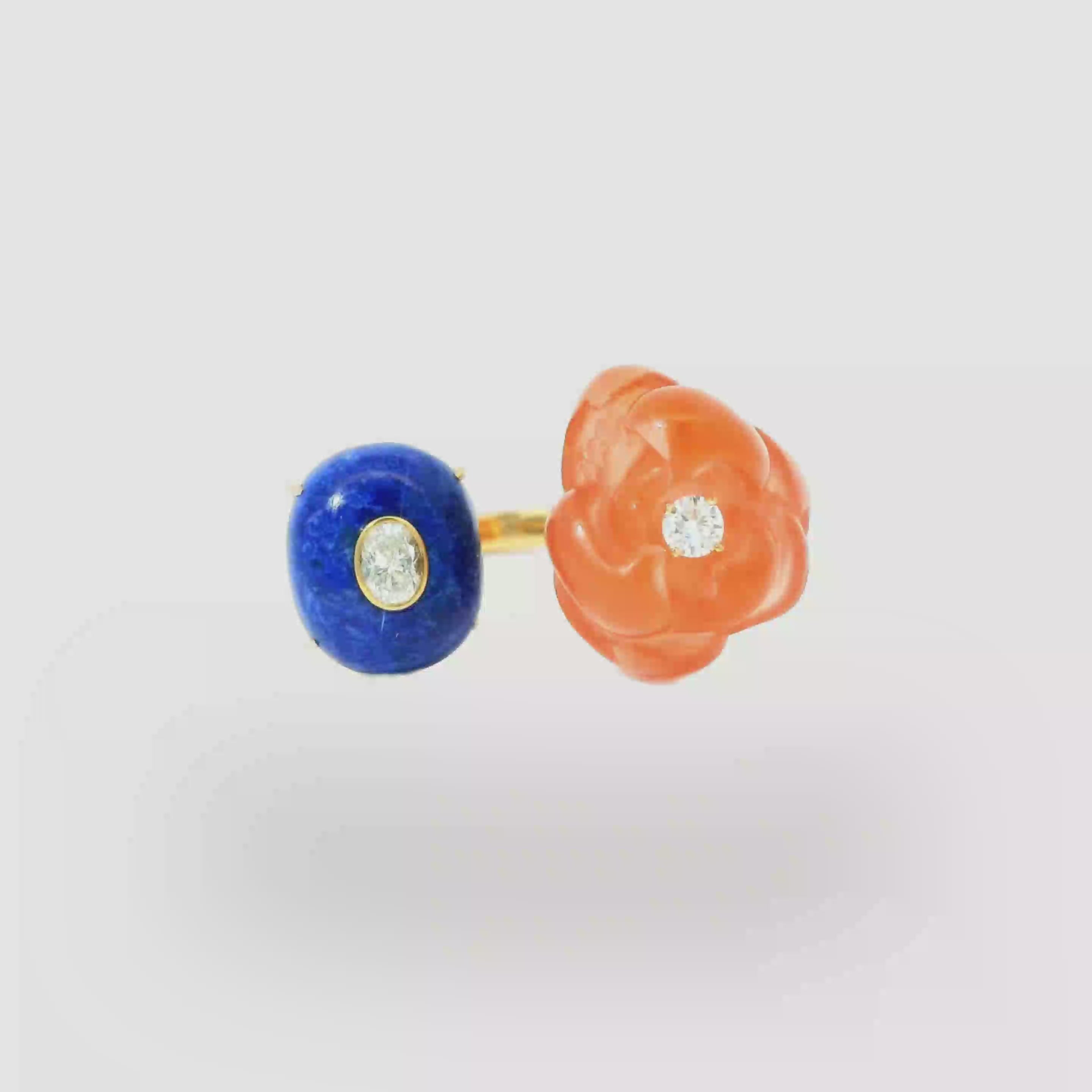 The Giardino Split Ring is handcrafted with approximately 0.3 carats of custom cut diamonds (0.1 carat round and 0.2 carat oval) inlaid in a hand cut cabochon lapiz and lotus set in shaped agate set with cultured diamonds D-E VS quality diamonds set in 4.88 grams of 18k yellow gold.