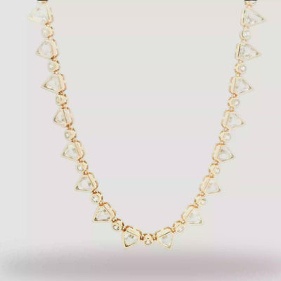 The Scudo Tennis Necklace is handcrafted with approximately 30-35 carats of custom round and shield cut white sapphire and 20.8-25 grams of 18k rose gold vermeil.