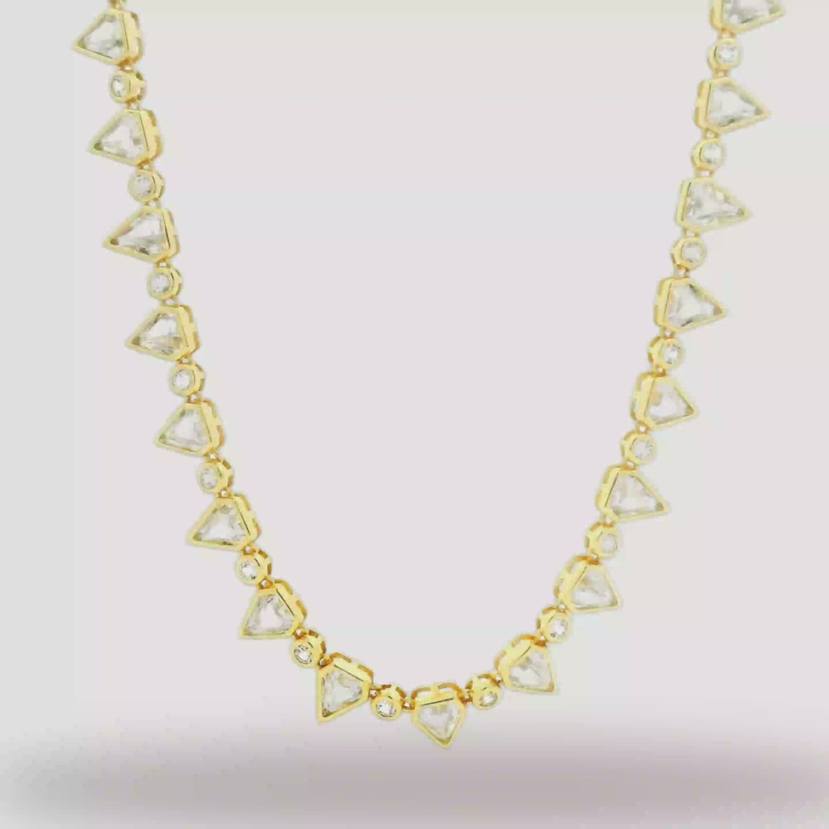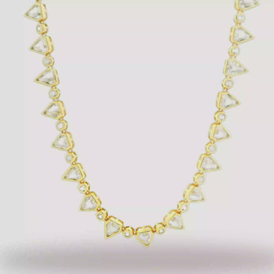 The Scudo Tennis Necklace is handcrafted with approximately 33-41 carats of custom round and shield cut diamonds and 32-42 grams of 18k yellow gold.