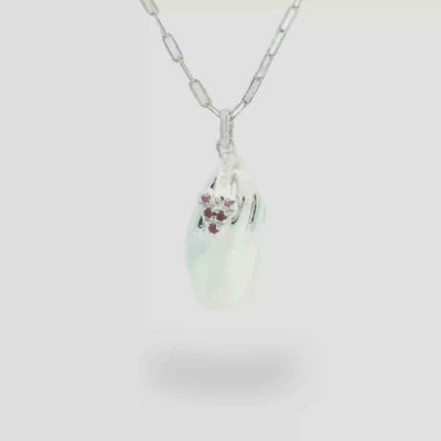 The Ma Che Vuoi? Pendant is handcrafted with approximately .05 carats of melee rubies and 4.7 grams of 18k white gold plated sterling silver with an additional underlayer of palladium for durability.