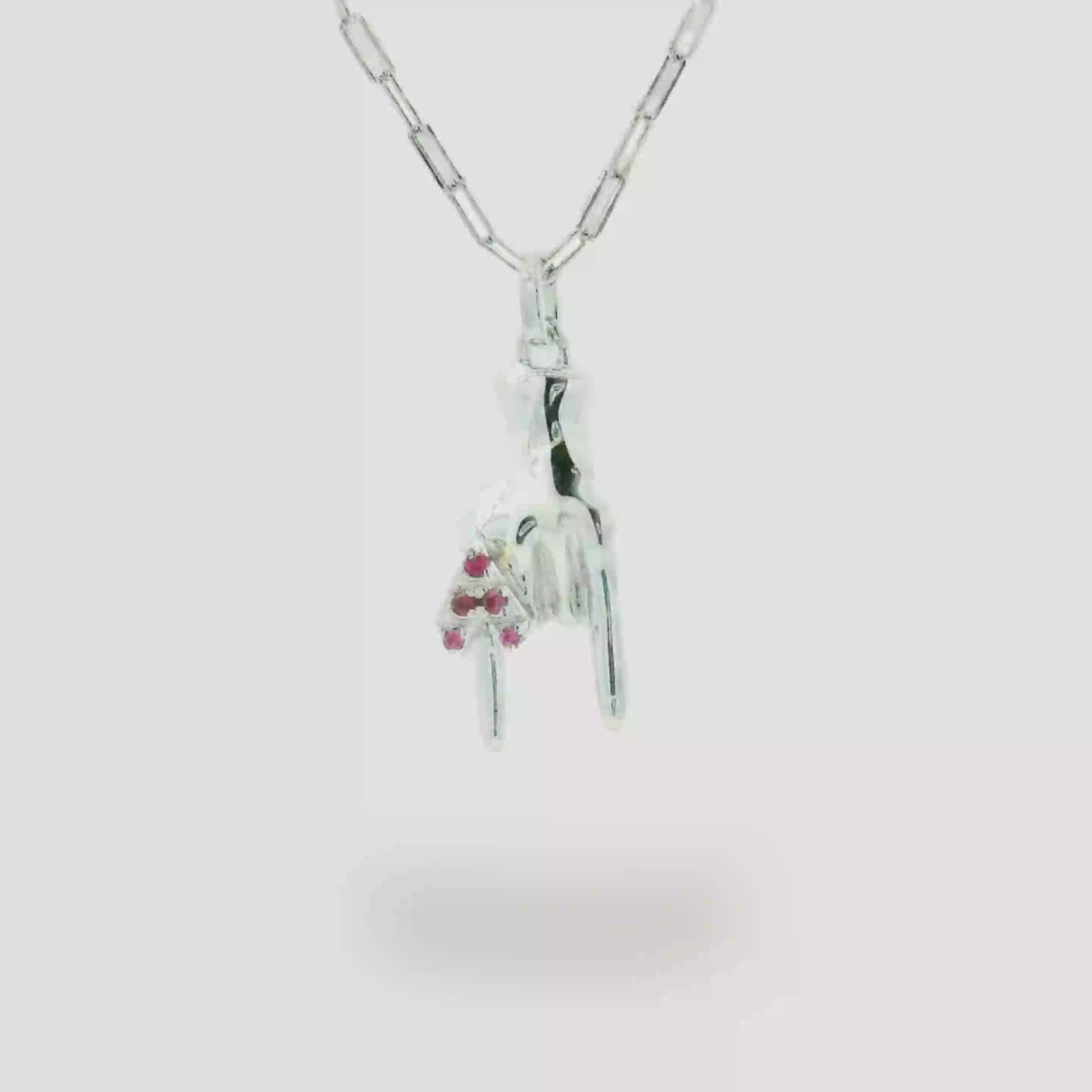 The Mano Cornuto Pendant is handcrafted with approximately .05 carats of melee rubies and 3.6 grams of 18k white gold plated sterling silver with an additional underlayer of palladium for durability.