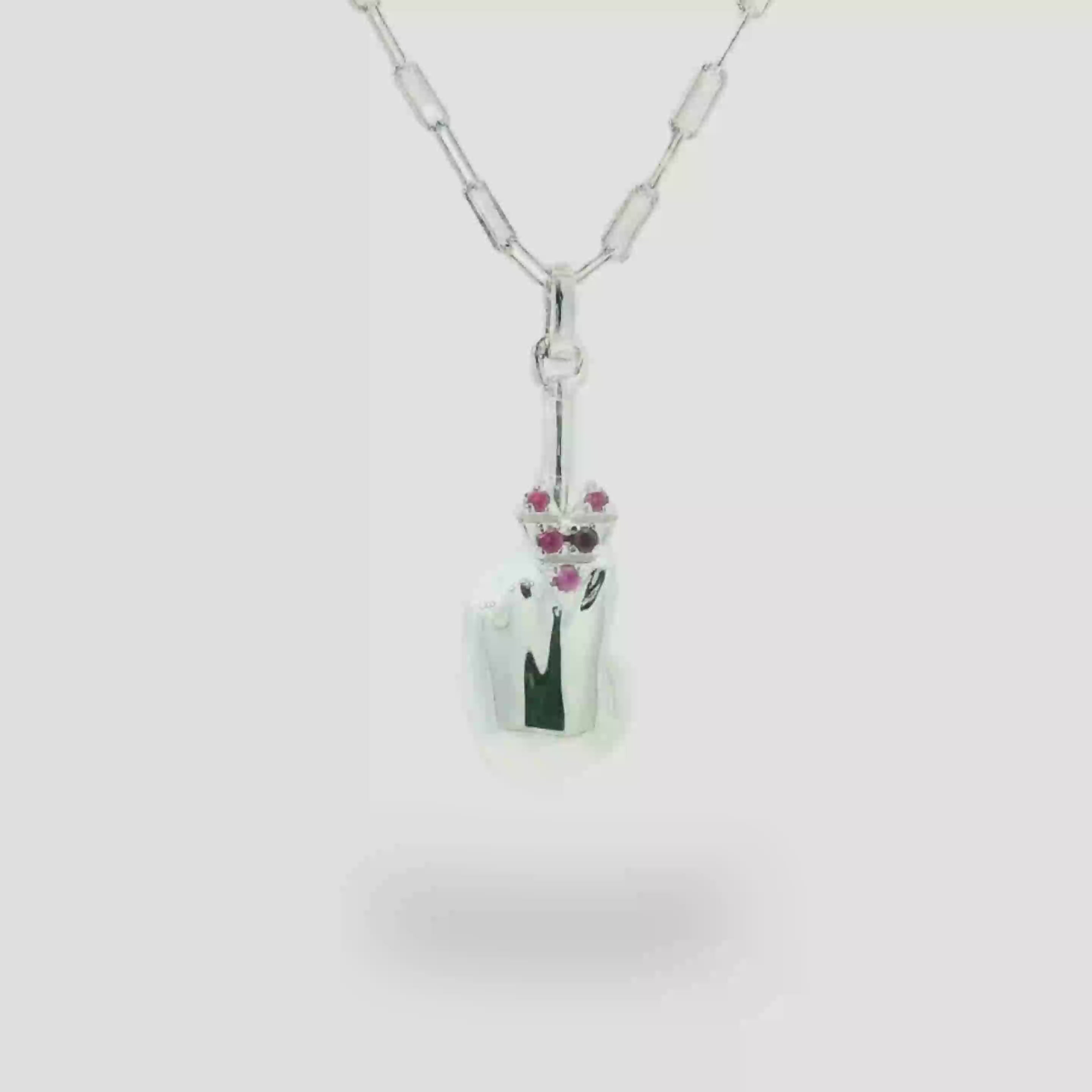 The Milano Borsa Pendant is handcrafted with approximately .05 carats of melee rubies and 3.8 grams of 18k white gold plated sterling silver with an additional underlayer of palladium for durability.