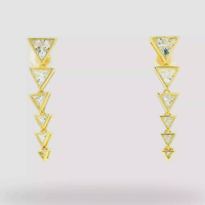 The Triangoli Earrings are handcrafted with 12 custom, hand faceted and polished, triangle cut white sapphires, weighing approximately 5 carats and 3.8 grams of 18k yellow gold vermeil.